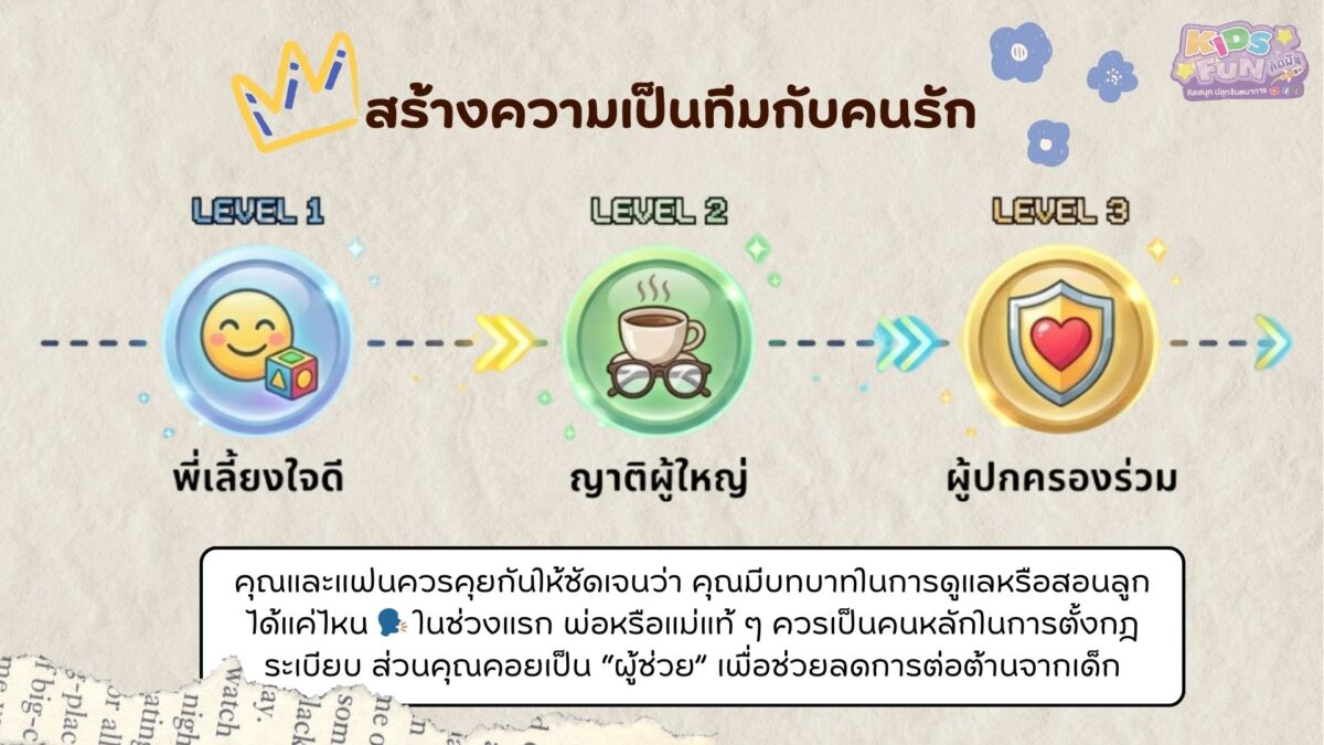 2.สร้างความเป็นทีมกับคนรัก: คุณและแฟนต้องสื่อสารกันชัดเจนว่าคุณสามารถดูแลหรืออบรมลูกได้แค่ไหน ในช่วงแรก พ่อหรือแม่แท้ๆ ควรเป็นหลักในการบังคับใช้กฎระเบียบ ส่วนคุณควรทำหน้าที่เป็น “ผู้ช่วย” เพื่อลดการต่อต้าน