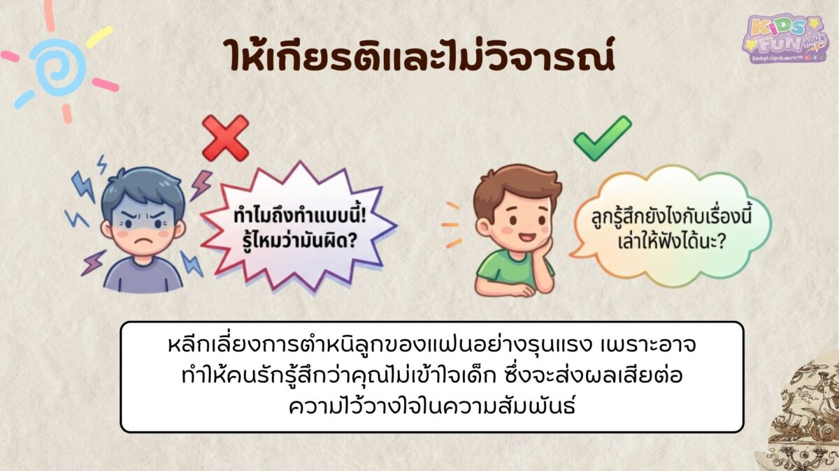 3.ให้เกียรติและไม่วิจารณ์: หลีกเลี่ยงการตำหนิลูกของแฟนอย่างรุนแรง เพราะอาจทำให้คนรักรู้สึกว่าคุณไม่เข้าใจเด็ก ซึ่งจะส่งผลเสียต่อความไว้วางใจในความสัมพันธ์
