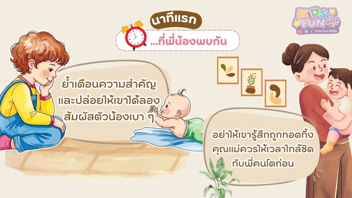 - ย้ำเตือนความสำคัญ ทันทีที่เห็นน้องครั้งแรก ให้บอกเขาว่า “นี่คือน้องที่หนูช่วยแม่ดูแลมาตลอดนะ” และปล่อยให้เขาได้ลองสัมผัสตัวน้องเบา ๆ โดยมีคุณพ่อคุณแม่ดูแลอยู่ข้าง ๆ