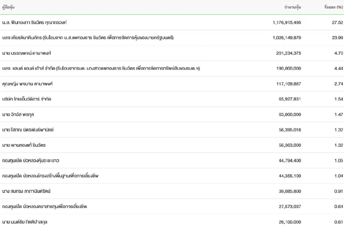 สัดส่วนคงเหลือหลังทำรายการ : กลุ่มของนางสาวแพทองธาร จะเหลือหลักทรัพย์ถือครองจำนวน 1,068,888,122 หุ้น หรือคิดเป็น 24.9899% ของสิทธิออกเสียงทั้งหมด